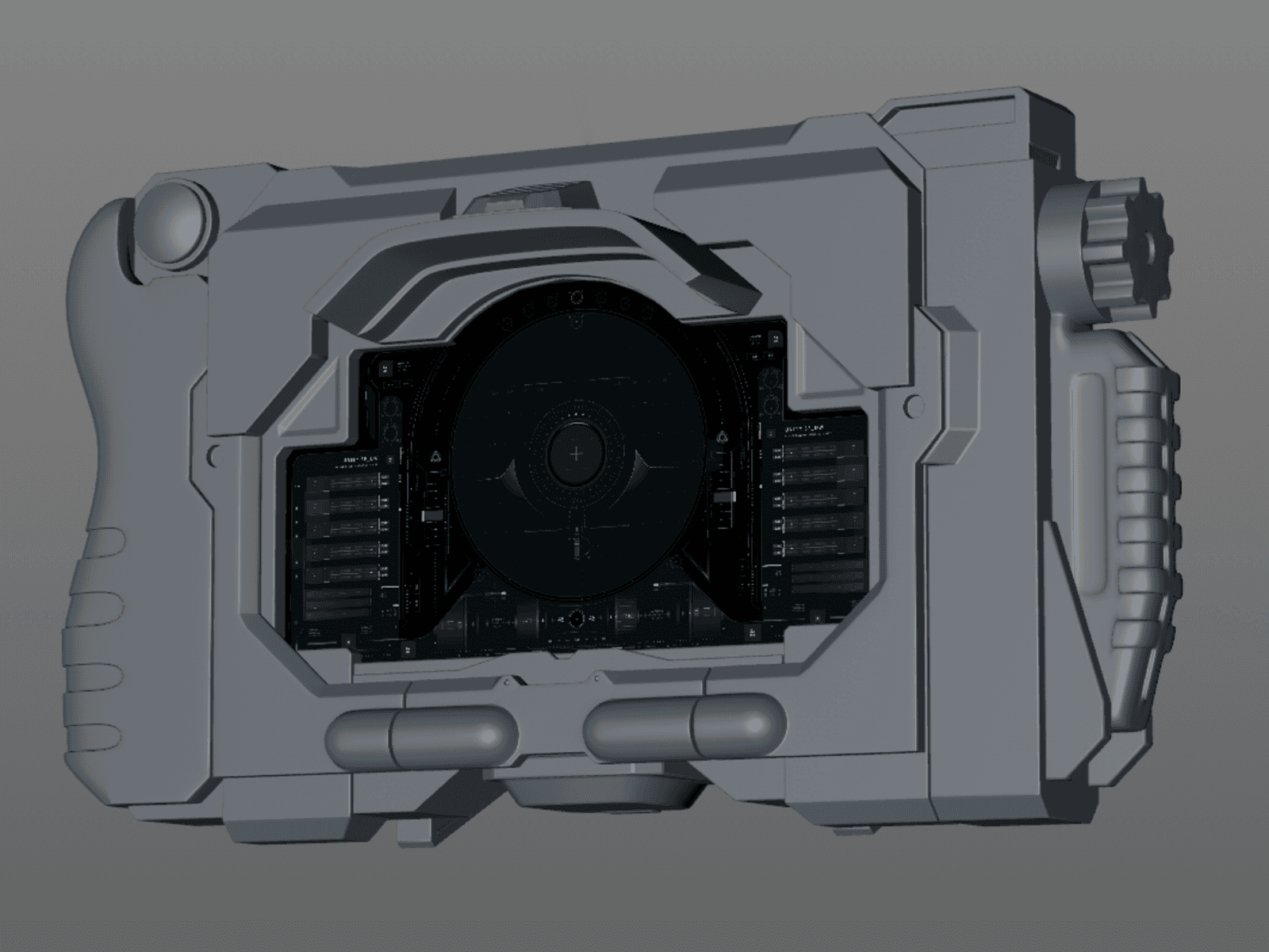 Once the UI design was complete, I modeled the interlocking pieces that would enclose the screen. These were handed off to our 3D printing artist who then painted the device to simulate rugged metals and worn plastics to give the gadget more authenticity, much like the process used for films.